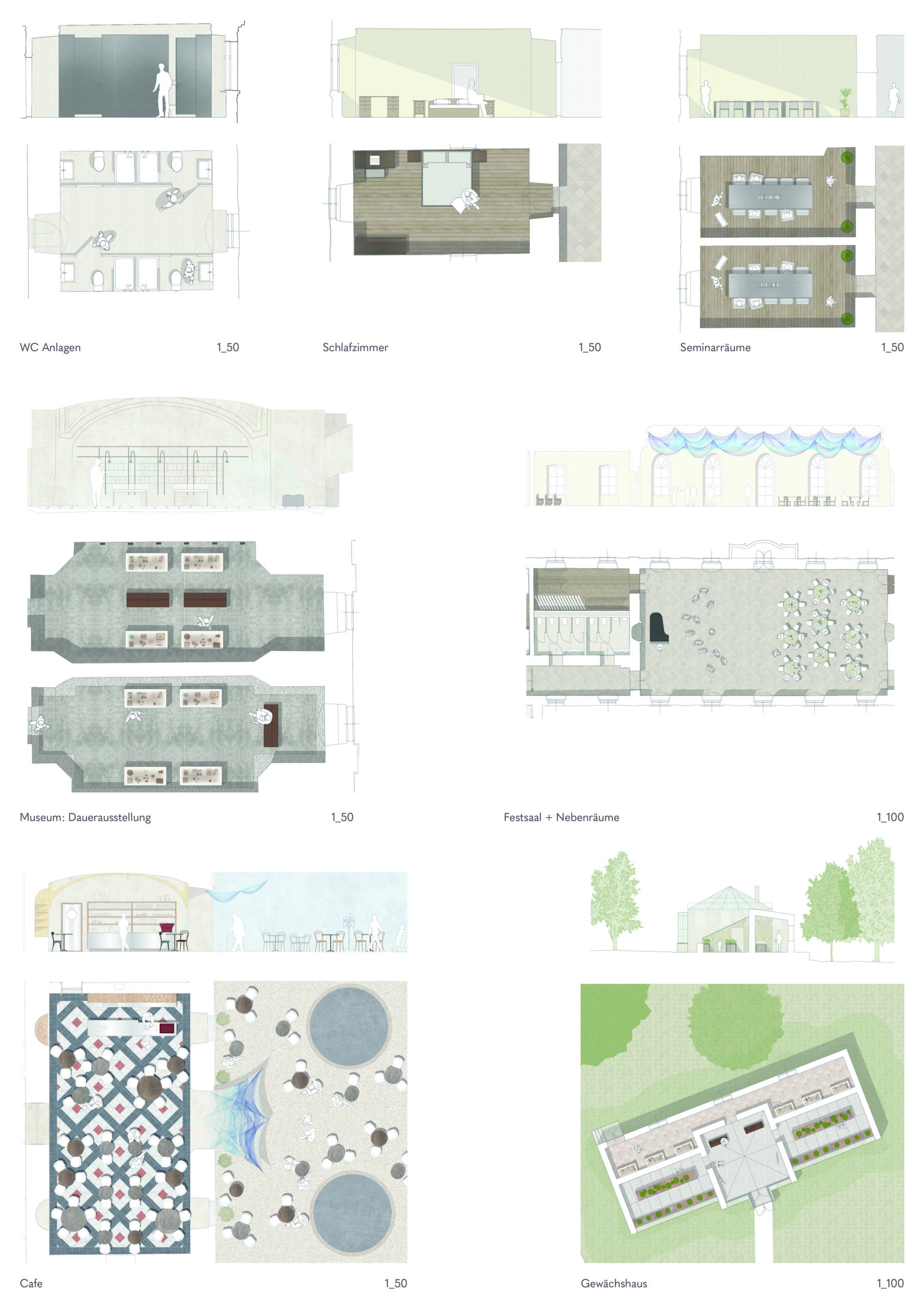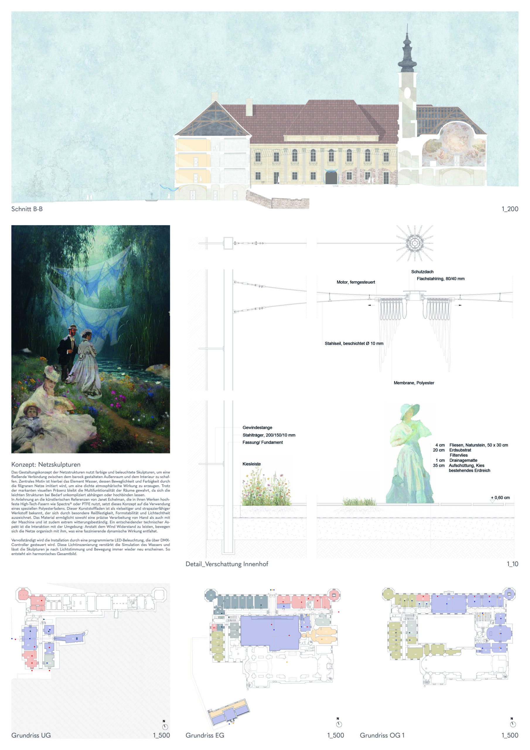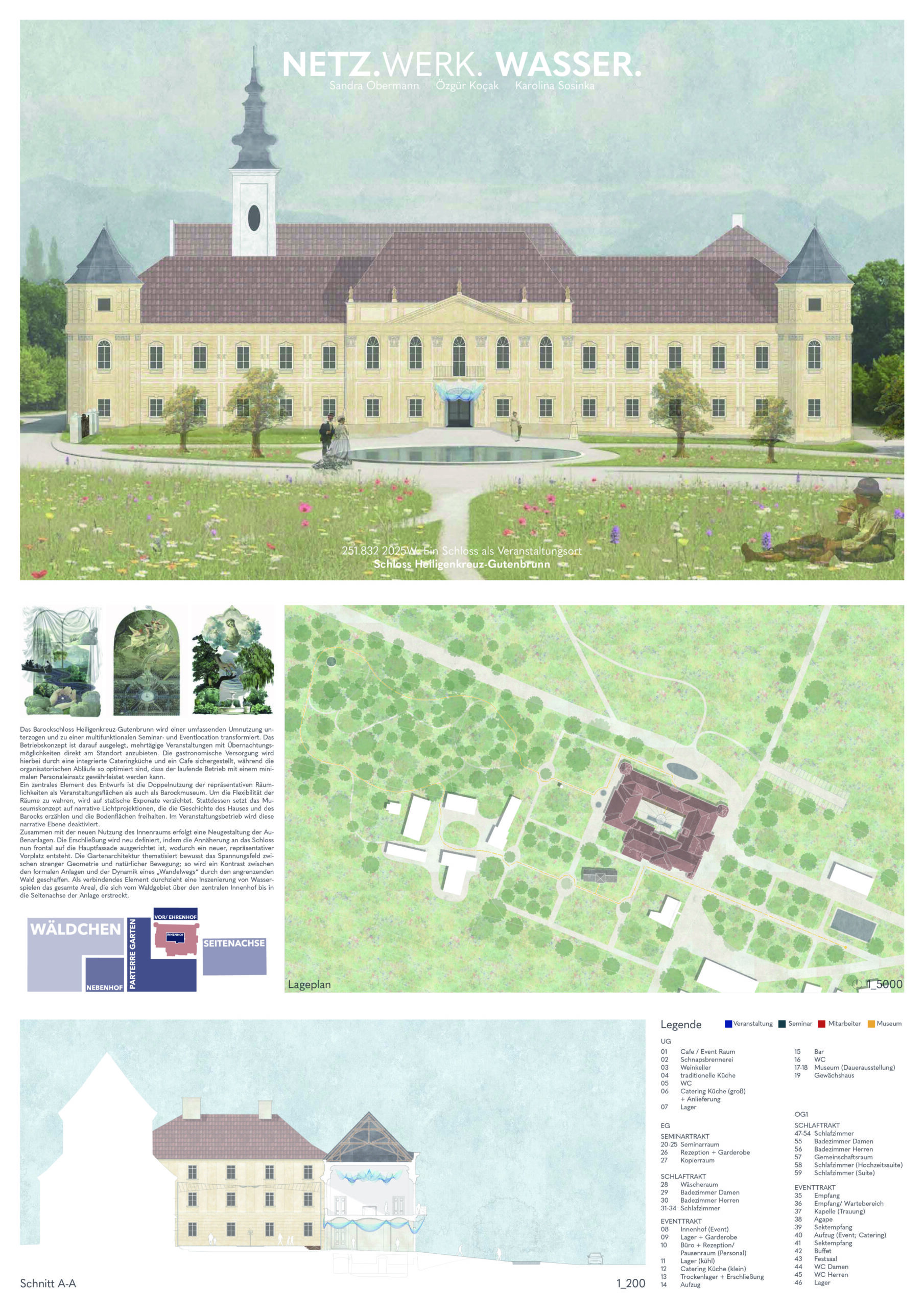 Das Barockschloss Heiligenkreuz-Gutenbrunn wird einer umfassenden Umnutzung unterzogen und zu einer multifunktionalen Seminar- und Eventlocation transformiert. Das Betriebskonzept ist darauf ausgelegt, mehrtägige Veranstaltungen mit Übernachtungsmöglichkeiten direkt am Standort anzubieten. Die gastronomische Versorgung wird hierbei durch eine integrierte Cateringküche und ein Cafe sichergestellt, während die organisatorischen Abläufe so optimiert sind, dass der laufende Betrieb mit einem minimalen Personaleinsatz gewährleistet werden kann. Ein zentrales Element des Entwurfs ist die Doppelnutzung der repräsentativen Räumlichkeiten als Veranstaltungsflächen als auch als Barockmuseum. Um die Flexibilität der Räume zu wahren, wird auf statische Exponate verzichtet. Stattdessen setzt das Museumskonzept auf narrative Lichtprojektionen, die die Geschichte des Hauses und des Barocks erzählen und die Bodenflächen freihalten. Im Veranstaltungsbetrieb wird diese narrative Ebene deaktiviert. Zusammen mit der neuen Nutzung des Innenraums erfolgt eine Neugestaltung der Außenanlagen. Die Erschließung wird neu definiert, indem die Annäherung an das Schloss nun frontal auf die Hauptfassade ausgerichtet ist, wodurch ein neuer, repräsentativer Vorplatz entsteht. Die Gartenarchitektur thematisiert bewusst das Spannungsfeld zwischen strenger Geometrie und natürlicher Bewegung; so wird ein Kontrast zwischen den formalen Anlagen und der Dynamik eines „Wandelwegs“ durch den angrenzenden Wald geschaffen. Als verbindendes Element durchzieht eine Inszenierung von Wasserspielen das gesamte Areal, die sich vom Waldgebiet über den zentralen Innenhof bis in die Seitenachse der Anlage erstreckt.