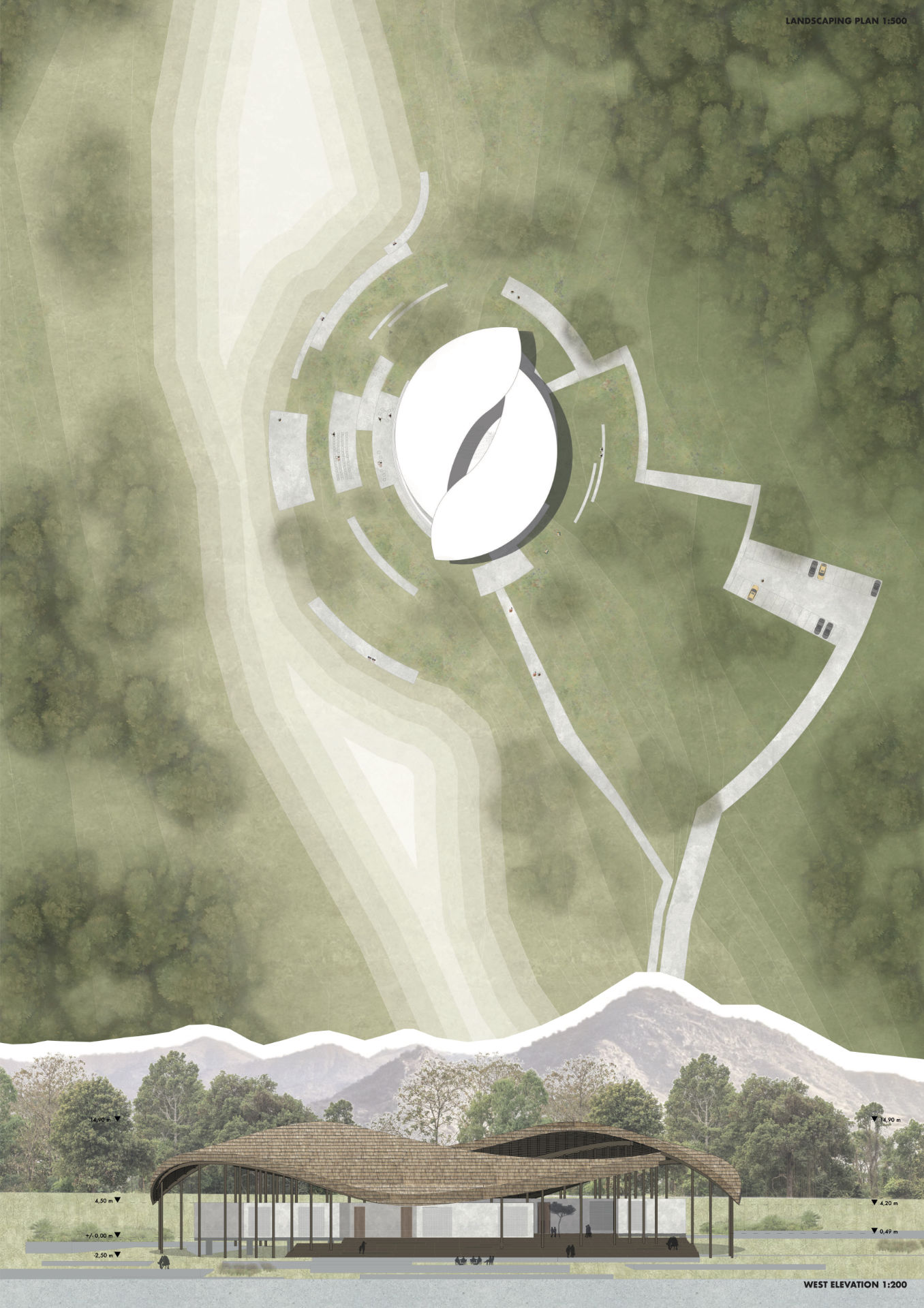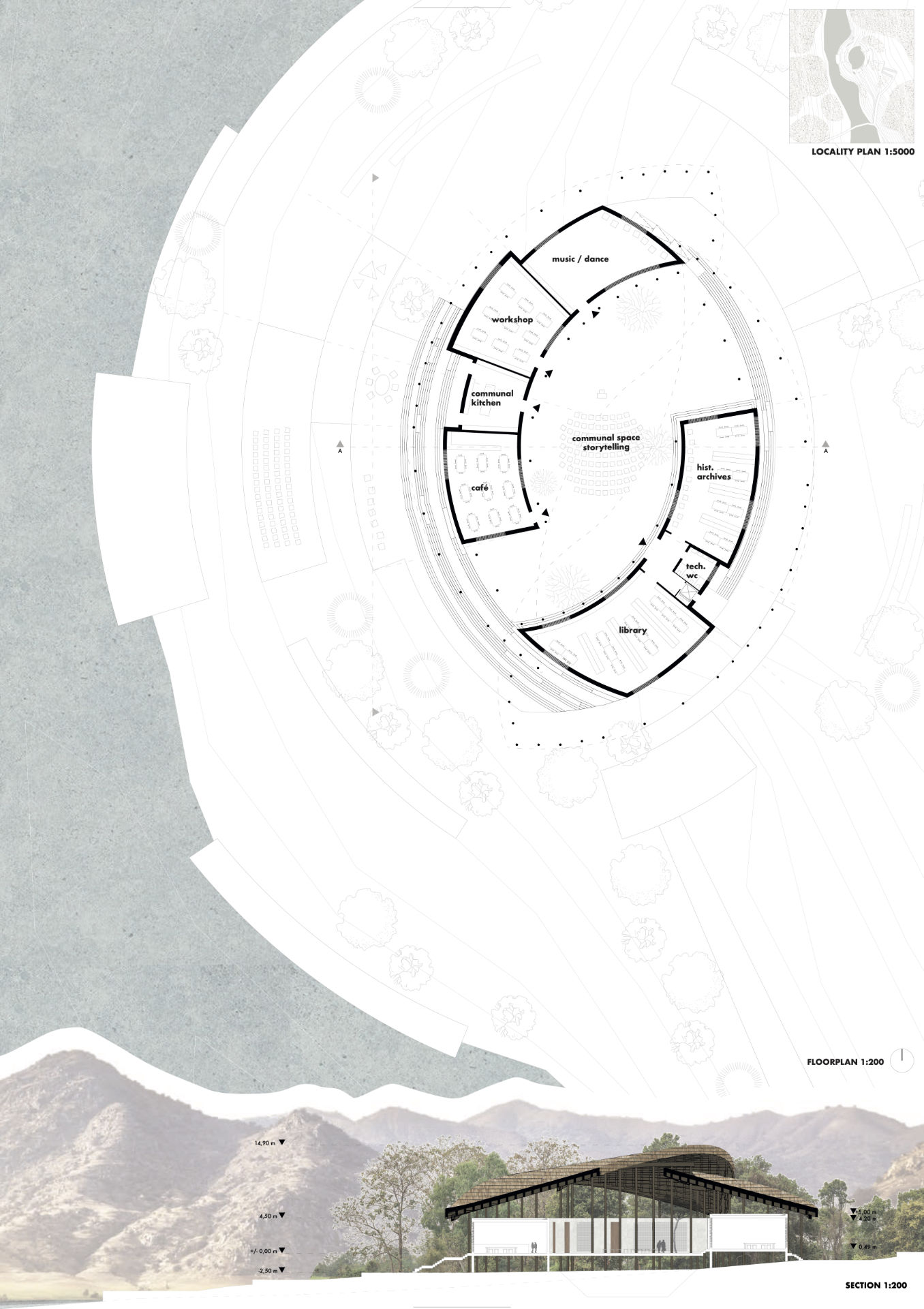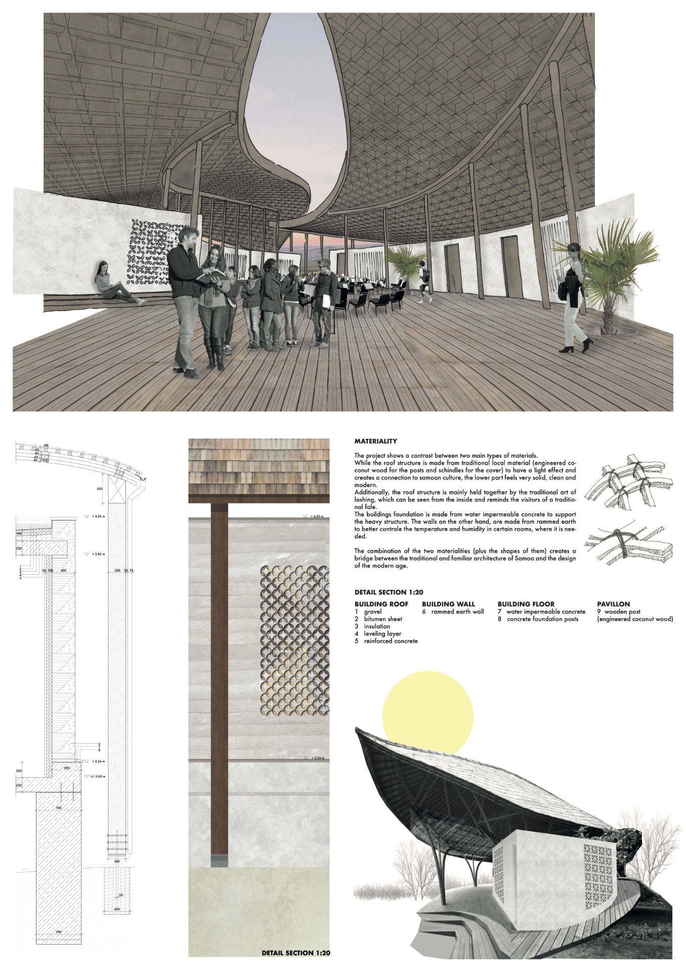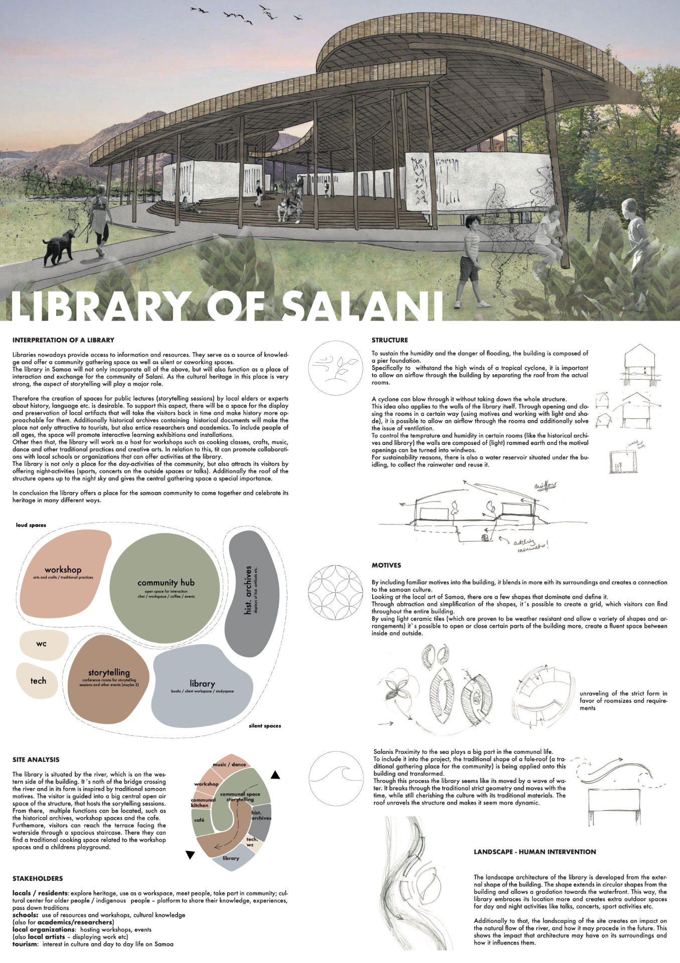 Libraries nowadays provide access to information and resources. They serve as a source of knowledge and offer a community gathering space as well as silent or coworking spaces. The library in Samoa will not only incorporate all of the above, but will also function as a place of interaction and exchange for the community of Salani. As the cultural heritage in this place is very strong, the aspect of storytelling will play a major role. Therefore the creation of spaces for public lectures (storytelling sessions) by local elders or experts about history, language etc. is desirable. To support this aspect, there will be a space for the display and preservation of local artifacts that will take the visitors back in time and make history more approachable for them. Additionally, historical archives containing historical documents will make the place not only attractive to tourists, but also entice researchers and academics. To include people of all ages, the space will promote interactive learning exhibitions and installations. Other than that, the library will work as a host for workshops, such as cooking classes, crafts, music, dance and other traditional practices and creative arts. In relation to this, it can promote collaborations with local schools or organizations that can offer activities at the library. The library is not only a place for for the day-activities of the community, but also attracts its visitors by offering night-activities (sports, concerts on the outside spaces or talks). Additionally, the roof of the structure opens up to the night sky and gives the central gathering space a special importance. In conclusion, the library offers a place for the samoan community to come together and celebrate its heritage in many different ways.